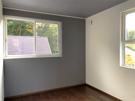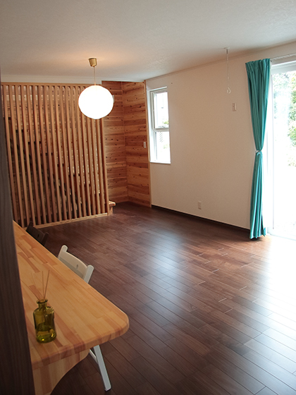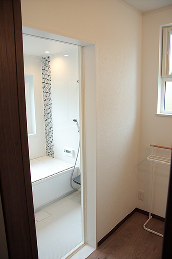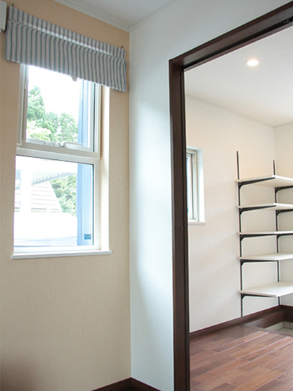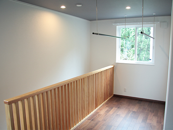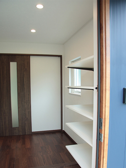 未来の家 将来を見据えた計画性ある間取りを考慮した家。家事動線は集中型としております。省エネを重視し断熱材を品質の良い物を取り入れ全室エアコンでの熱効率を最大限いかす設計で夏涼しく冬暖かい作りとなっております。 外観 紺色を外壁とし白の窓枠。 照明は船舶風な照明を選択。エアコン配管、雨どい、 破風板など付帯部分は黒とし外観の色調を整えました。 エントランス エントランスはプライバシーを確保しつつ最適な明かり取りをできるように考慮いたしました。 リビング&キッチン リビングは大きめのプライバシーガラスで断熱効果の高い省エネガラスを採用、明るいリビングでありながら紫外線もカットあえて仕切り等を排除し一つの空間としました。リビング奥は階段となっており階段を飾り格子としました。 水廻り 水廻りは限られたスペースの中、脱衣所兼ランドリールームを広めに取りトイレはサイズを小さめに取りました。 2階ホール 2階ホールはサンルームとし明かり取り、干し台を設置 主寝室 子供部屋 主寝室と子供部屋は落ち着きのあるグレーとアイボリーの色調で…. プライバシー確保と熱効率を兼ねた明かり取りといたしました。